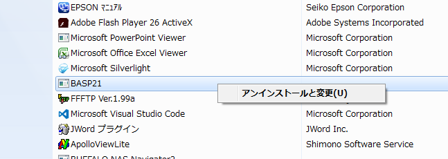 また、「送信用ソフト『BASP21』」をインストールされた場合は[コントロールパネル]の[プログラムと機能]