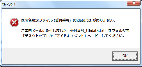 (「所定の場所に『(受付番号)_tthdata.txt』が無い場合、ソフトを起動したときの表示)