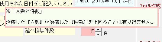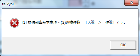 という画面が表示されます。これは「『治療人数』が『延べ治療件数』を超えている」というエラー表示です。この画面で「OK」をクリックすると